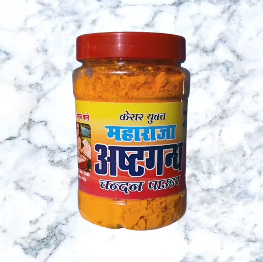 Maharaja Ashtagandha Chandan is a brand of sandalwood powder used in religious ceremonies, known for its authentic, traditional formulation and aromatic fragrance. It is primarily used to apply tilak on the forehead, but can also be used in abhishekam (ritual bathing) and other puja activities.